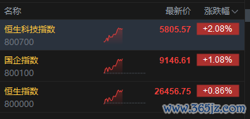 1月12日消息,港股三大指数高开高走。截至午间收盘,恒生指数涨0.86%,报26456.75点,恒生科技指数涨2.08%,国企指数涨1.08%。盘面上,科网股普涨,美团涨超7%,快手、哔哩哔哩、阿里巴巴涨超5%,百度涨超4%,京东、腾讯涨超2%,联想跌超2%;AI概念股强势,智谱涨超31%;影视股涨幅居前,大麦娱乐涨超6%;商业航天概念继续上涨,亚太卫星涨13%;豪威集团今日上市,首日涨超15%。