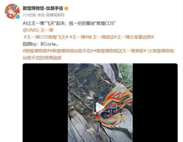 极目新闻记者注意到聚点股,“敦煌博物馆-丝路手信”账号又发布了一段AI制作的王一博“飞天”视频。该工作人员向极目新闻记者介绍,AI技术让王一博的“飞天”照片动了起来,这一次的联动,不管是对于这项运动(攀岩),还是对于飞天文化,都是一次很好的传播。事实上,他们和王一博的缘分已经很久了,2019年他们就曾赠送过王一博定制的飞天图案滑板。