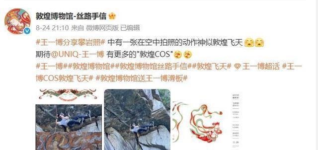 8月25日聚点股,演员王一博的一张攀岩照片火出了圈,照片中他以绳索悬垂于岩壁,身体横向舒展。其肢体延展开来的飘逸感,以及核心力量带来的平衡性,被网友发现形似敦煌壁画中的飞天姿态。敦煌博物馆文创品牌官方微博“敦煌博物馆-丝路手信”也转发了这张照片,配文称“动作神似敦煌飞天”。